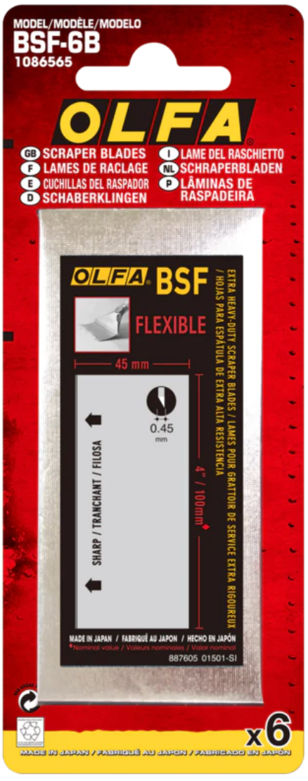 For tough adhesives, paint, epoxy, or other coatings, choose the double-edged flexible scraper blade OLFA 100mm BSF-6B. Made from premium carbon tool steel, this four-inch wide blade is tall and flexible. The longer head allows reaching difficult-to-access areas. The flexible design of the blade tackles softer materials without damaging the working surface.
